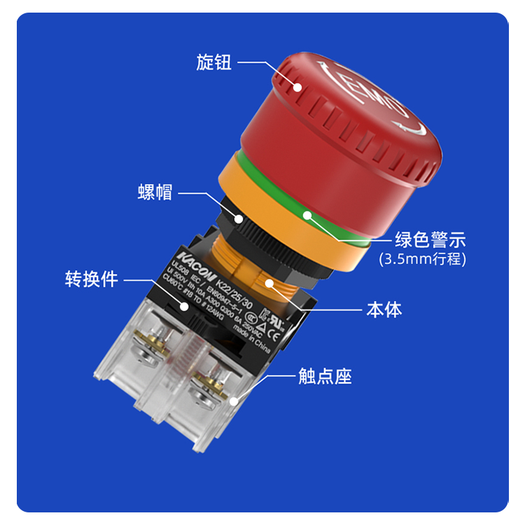 此外,凱昆K22系列急停按鈕開關(guān)的結(jié)構(gòu)設(shè)計具有較高的強度和穩(wěn)定性,